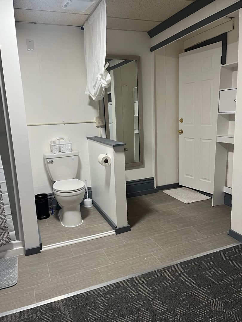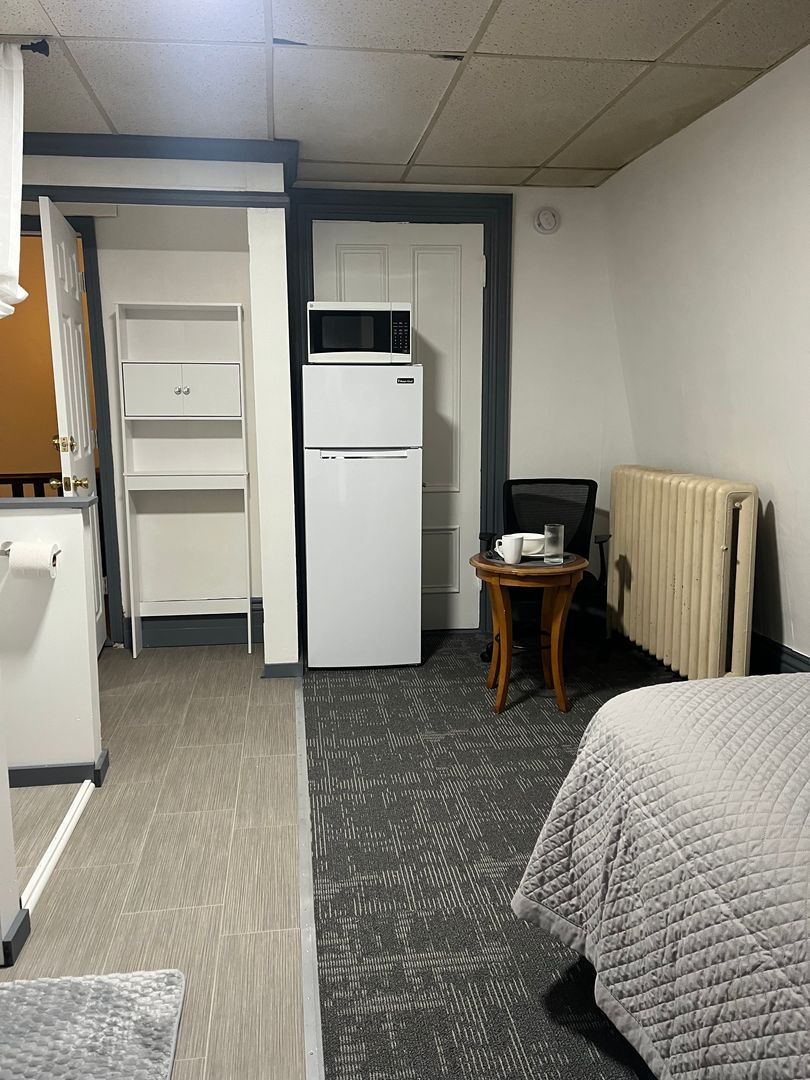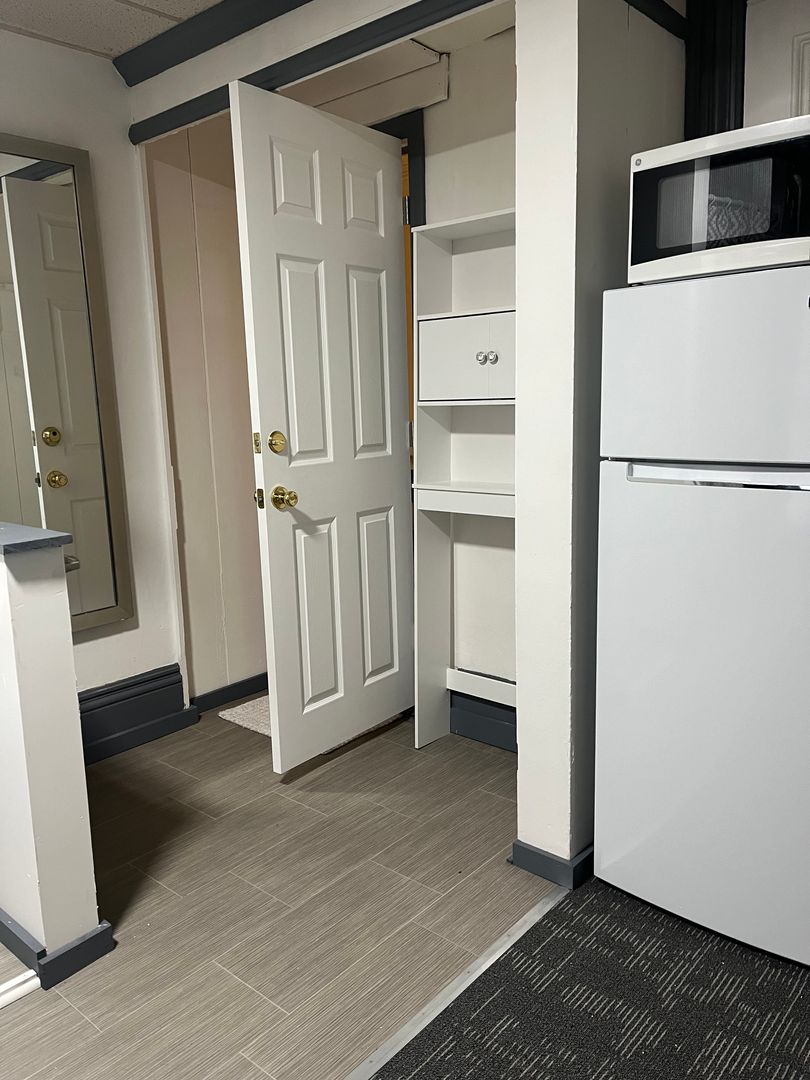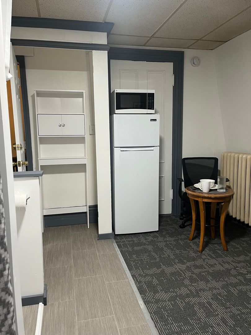 Newly renovated efficiency. Furnished. kitchenette, walk -in shower unique back lit mirror, refrigerator, convection cooktop. Extra long full sized bed with a very nice grey and white color scheme. Chair and small table gives you room to sit and unwind or work on your lap top. Great to come home to after a long day at work.