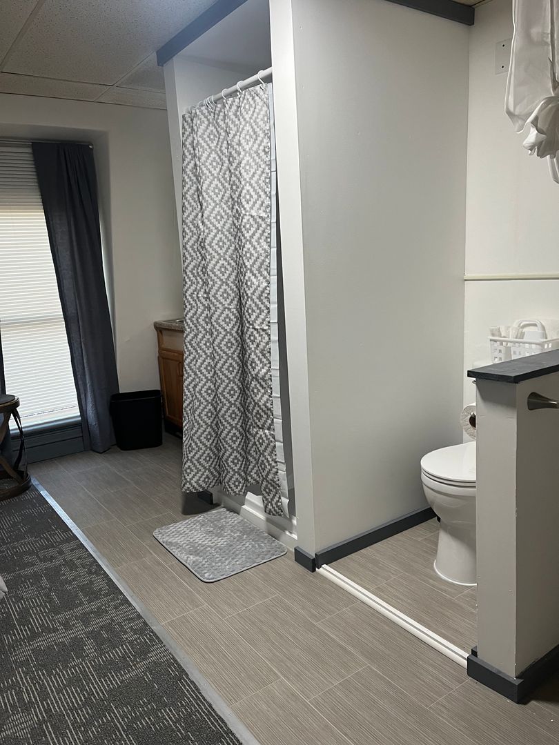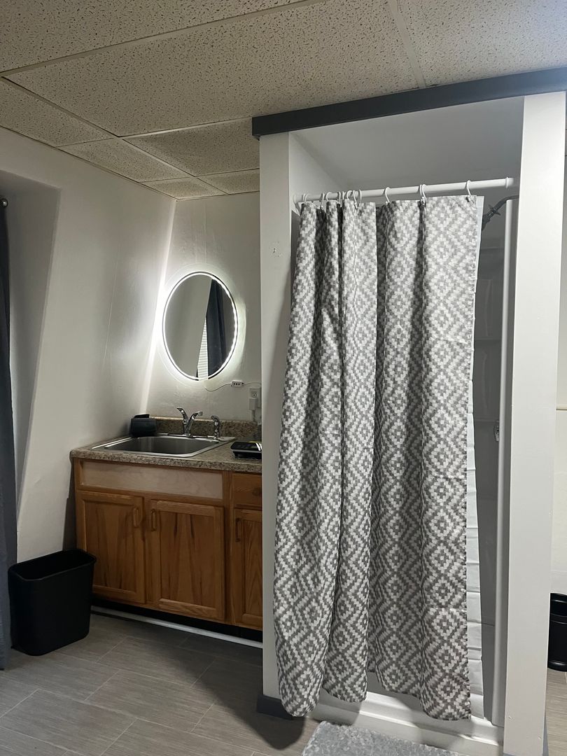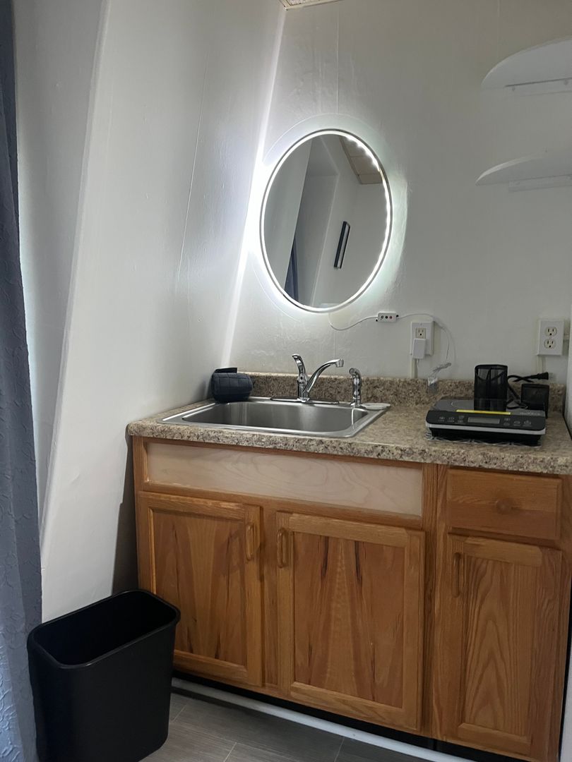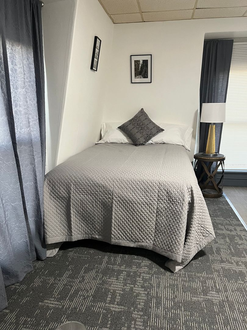 Newly renovated efficiency. Furnished. kitchenette, walk -in shower unique back lit mirror, refrigerator, convection cooktop. Extra long full sized bed with a very nice grey and white color scheme. Chair and small table gives you room to sit and unwind or work on your lap top. Great to come home to after a long day at work.