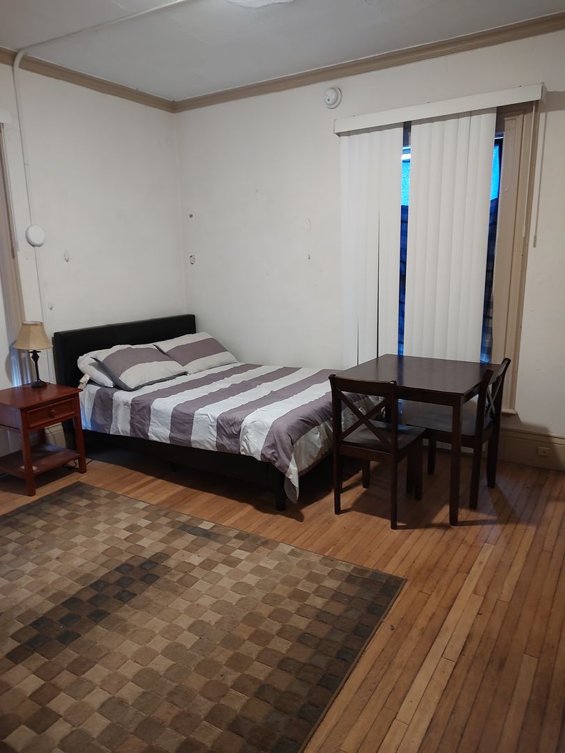 Fully furnished, full sized bed, all utilities included - heat, hot water, wifi. Shared kitchen and bath.